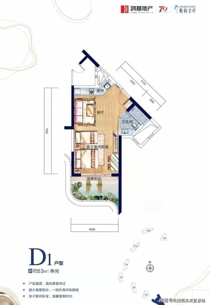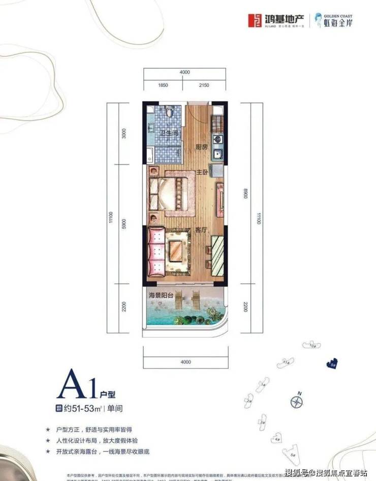 【A1户型】52㎡ 单间含开放式亲海露台,户型方正,舒适与实用率皆得,放大度假体验。
