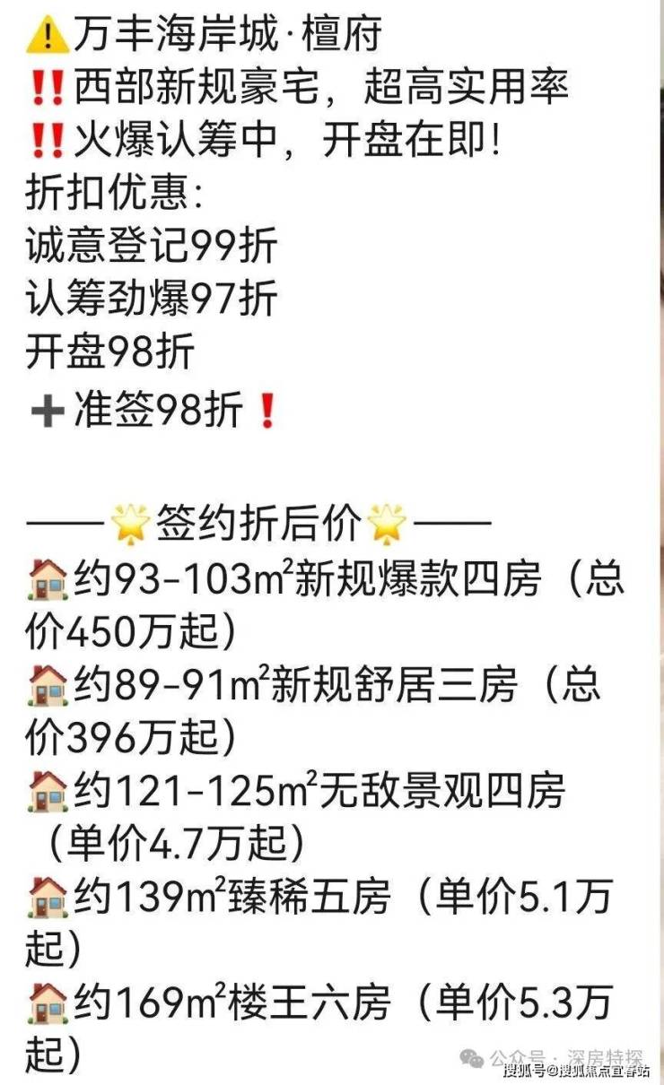 万丰海岸城檀府已经取证,备案均价5.41万/㎡,备案总价431-1053万,已经启动认筹,将于25日开盘,开盘享受99*97*98,约94折优惠。折后总价406万起,折后单价4.57万起,首推89-91㎡三房二卫,93-103-121-125平米的四房二卫,139㎡的五房二卫,169㎡的六房。据了解本次使用率高达104%。