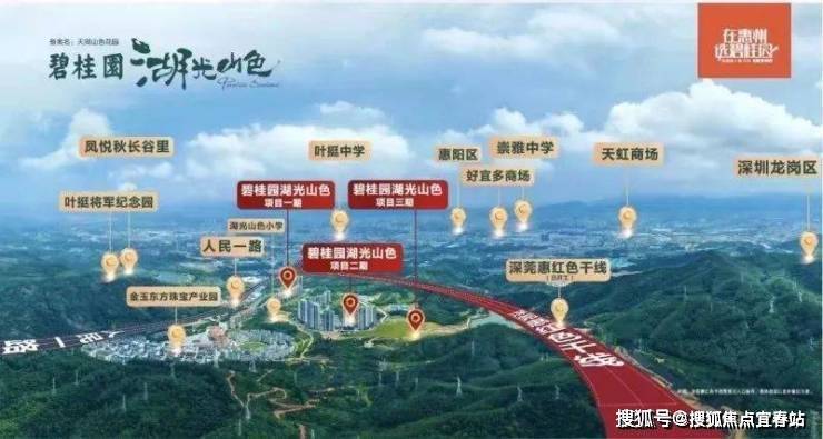 碧桂园湖光山色,一山之隔即龙岗,与深圳直线距离仅约4公里,项目旁深莞惠红色干线(快速路)已动工,惠坪高速计划今年10月动工,深圳外环高速已开通,往返深圳更快更便捷;深惠城际已确定设点新圩站,目前深圳段已动工。