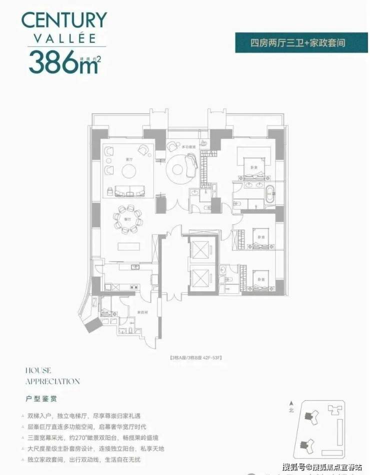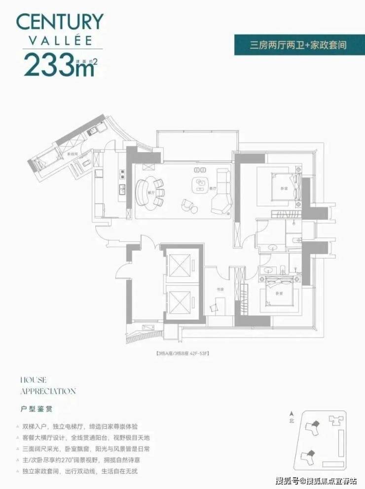 约233㎡3+1房3卫 A户型,西北朝向看名商和沙河高尔夫