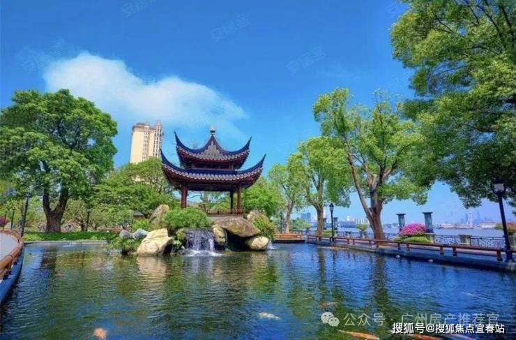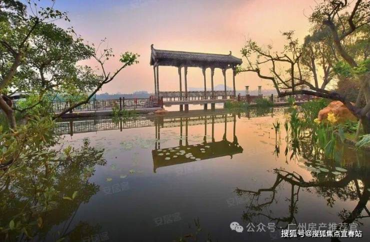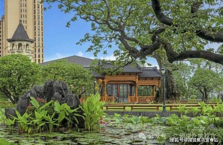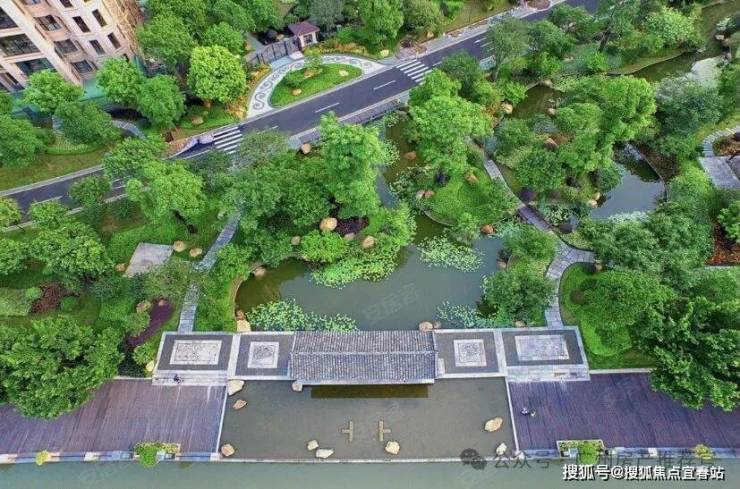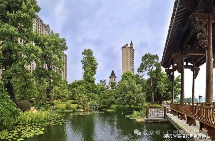 然后踏入小区的大门后,一边是经过全面升级的2.5公里木栈道旁一湾珠水款款流动。一边是江、池、荷、亭台楼阁融会一体的小区园林“夕露园”。