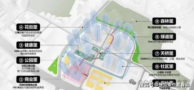 整个项目以双慢行道、两处公园、三重休闲、五大花街景轴打造超级绿量慢行道系统赋氧公园大城。并以“一轴两公园三中心”概念,匠筑约500m大城的立体城市连廊系统,无缝串联全龄教育、精致商业、品质人居、活力运动、公园休闲等功能板块。