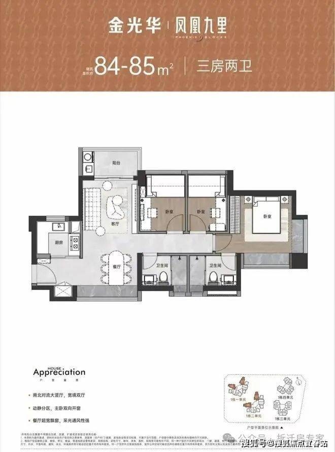 85㎡的3房2厅2卫(01.07户型),设计的是竖厅南北通透格局,主卧双飘窗设计,U型厨房,客厅阳台主朝西北、东北向。