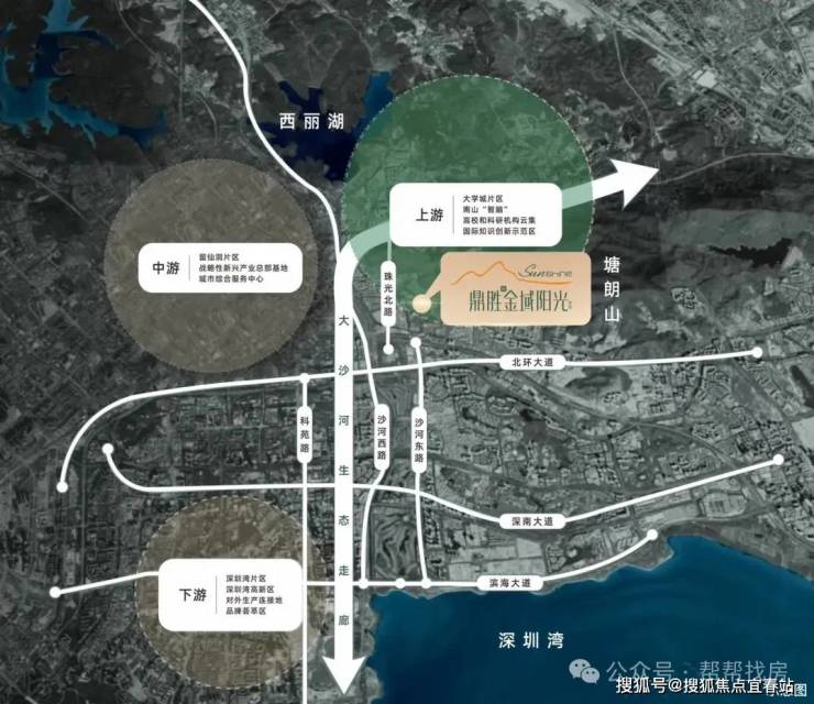 此外,从更广阔的城市坐标来看,一条集科技轴线、生态走廊、豪宅带于一身的深湾中轴线映入眼前,其如同深南大道串联起深超总-高新园-留仙洞-西丽湖国际科教城等产业高地,汇集了全深圳2/3的高端研发人才、40%高新技术企业及60%的重点实验室和工程技术中心,是南山的发展主脉。