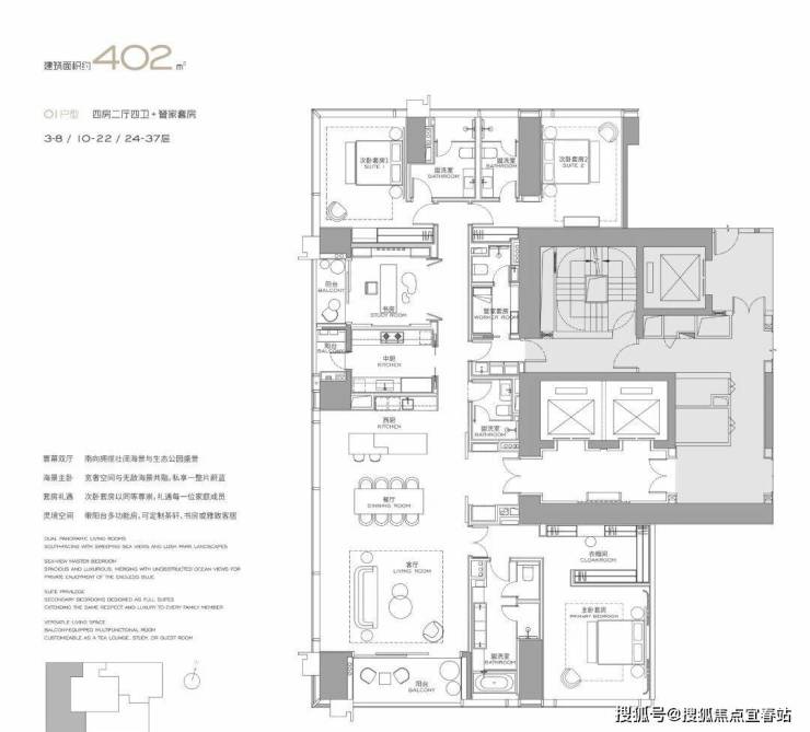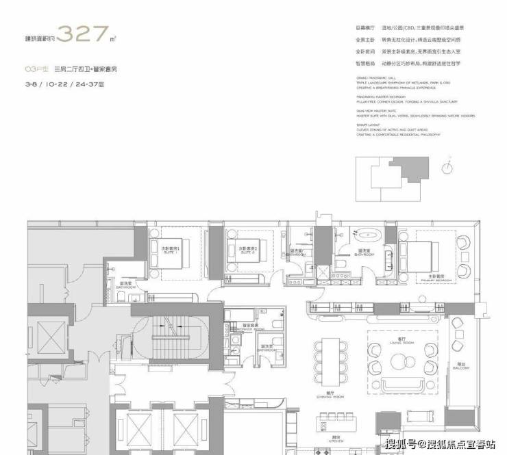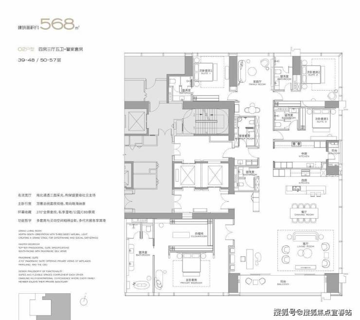 (3-57层)T3栋 四房四卫+家政套间。中西厨分区,餐客西厨一体,带多功能房。端头位置,三面采光。功能完备,房间数充足;实现了主仆双动线;会客观景视野一流。