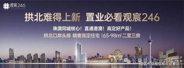 观宸246,位居拱北口岸头排,珠澳同城核心板块,城市中心+口岸物业双极加持,近10年来距离拱北口岸、港珠澳大桥口岸最近的纯住新盘,左手澳门世界级休闲娱乐配套,右手拱北城市烟火生活,坐享醇熟配套,畅享港珠澳三城无界生活。