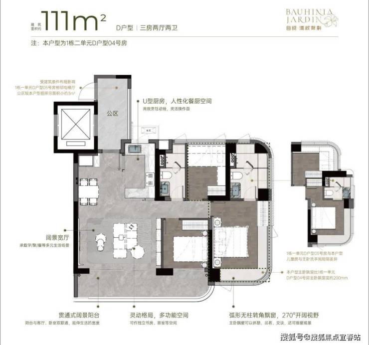 2)灵动空间格局,因更高的获得感而松弛• 四梯五户,独立电梯厅;• 户户均有南向视野,空间格局通透敞亮;• 270°弧形无柱大尺度飘窗、大宽厅、大阳台,带来更多使用空间。