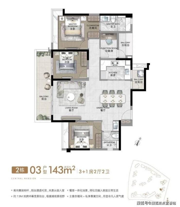 建面约143㎡4房2厅2卫,豪华主卧套房,超大 270°转角飘窗,大面宽采光面+超大方厅,约14.6m超大南向采光面,双面景观阳台+满飘窗,约7.3m 超大阳台。