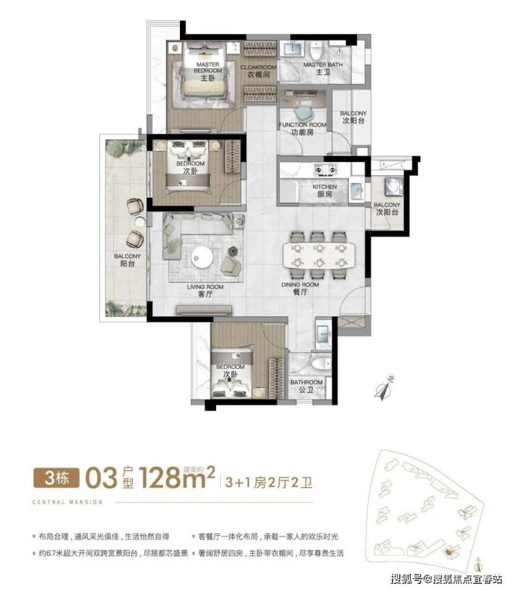 建面约128㎡4房2厅2卫(竖厅)豪华主卧套房,超大270°转角飘窗,双阳台对流,大面宽采光面+超大方厅,约13.9m超大南向采光面。