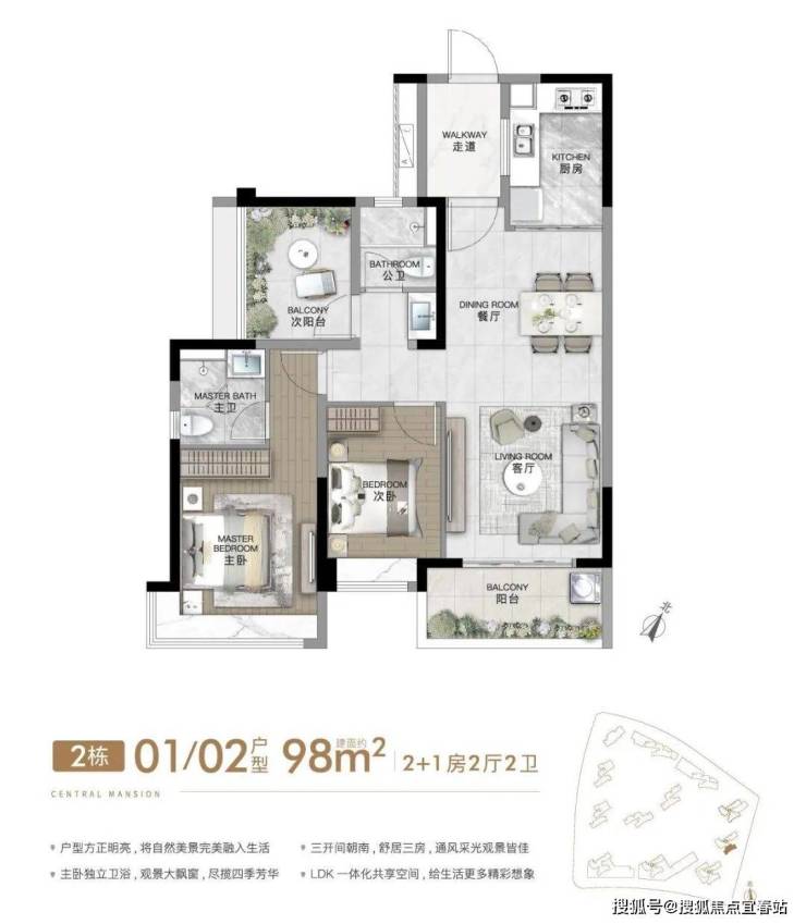 建面约98㎡ 3房2厅2卫,豪华主卧套房,超大270°转角飘窗,三开间朝南。约10m大尺度南向采光面。
