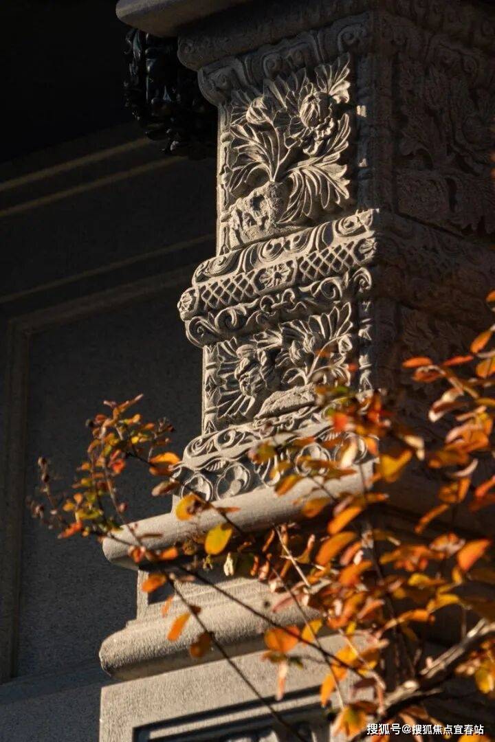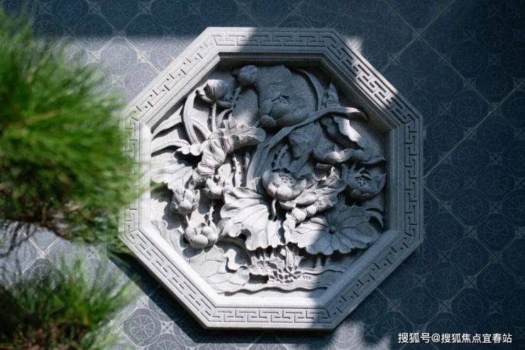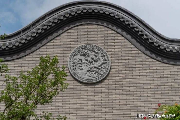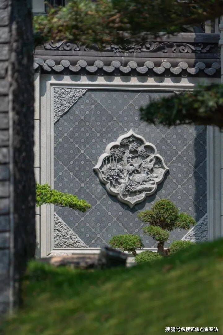 如下图这方圆形石雕,以经典的"松鹤图"为题材,采用深浅浮雕相结合的技法,在有限的圆形构图中营造出深远的意境。整体构图遵循传统"天圆地方"的理念,圆形象征吉祥永续。石质温润,青灰色基调更显古朴雅致,在光影变化中,与主体建筑和谐统一,共同构成了滨江侨院的建筑肌理。