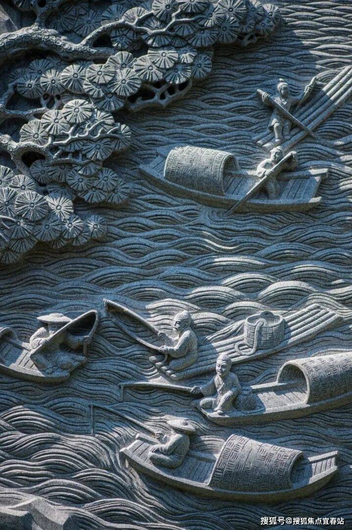 如下图的石雕山水画挂屏,以“明四家”之一仇英的山水画为蓝本进行石雕刻画。整幅作品将水的波纹、树的形态、枝叶雕刻得灵动清晰,近看工艺细腻、远观层次分明。