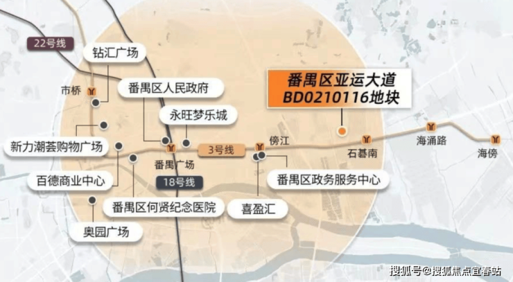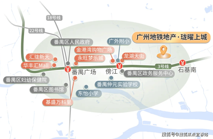 同时,得益于 3 号线东沿线的开通和亚运大道的连接,项目能受到番禺广场商圈的辐射。1 站之外的傍江站,龙湖天街正在建设;2 站到番禺广场,有永旺梦乐城、百德商业中心等大型商业综合体。