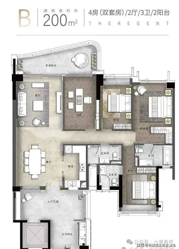 建面约200㎡:4房(双套房)2厅3卫2阳台私属电梯入户一线临江大宅简约半开放式厨房,美味品味兼得多功能入户花园,定制仪式感空间阔绰双主套房设计,尊享舒奢起居