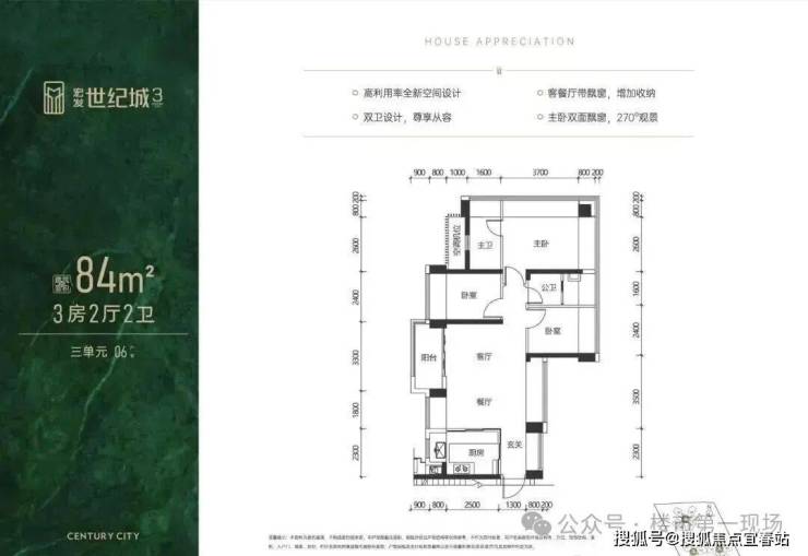 84㎡的3房2厅2卫,设计的是横厅南北通透格局,客餐厅5.1米开间,LDKB一体化设计,全屋10面飘窗,五开间朝南,主卧双面飘窗270°观景,3个卧室分别做到了主卧15.3㎡/次卧8.16㎡/次卧7.68㎡(包含墙体飘窗),U型厨房,卫生间干湿分离,阳台5.61㎡主朝西南向(差不多正西)。得房率约103.32㎡(包含赠送),赠送面积有22.8㎡。