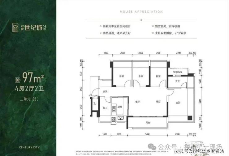 97㎡的4房2厅2卫,设计的是横厅南北通透格局,客餐厅5.4米开间,LDKB一体化设计,全屋9面飘窗,五开间朝南,主卧双面飘窗270°观景,4个卧室分别做到了主卧16.1㎡/次卧8.75㎡/次卧7.92㎡/次卧7.76㎡(包含墙体飘窗),U型厨房,卫生间干湿分离,阳台9.72㎡主朝正南向。得房率约97.35㎡(包含赠送),赠送面积有21.9㎡。
