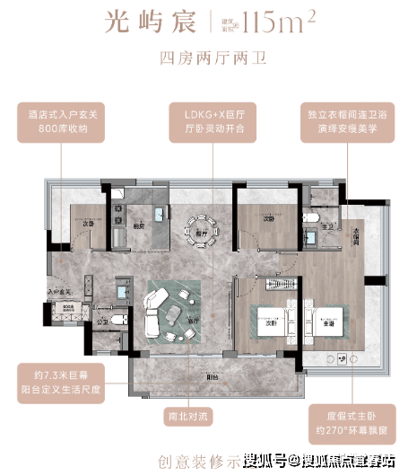 115㎡的4房2厅2卫,设计的是竖厅南北通透格局,进门入户玄关,客厅4.45米开间,餐客厅分离设计,客厅连接次卧出10.87m²的观景大阳台,L型中式+岛台灵动式厨房,公卫三段式干湿分离,得房率约78.27%(不含赠送),阳台主朝东南或西南向。靓点:南北对流+7.25米长超大观景南向阳台,超大主卧+270°无柱转角飘窗