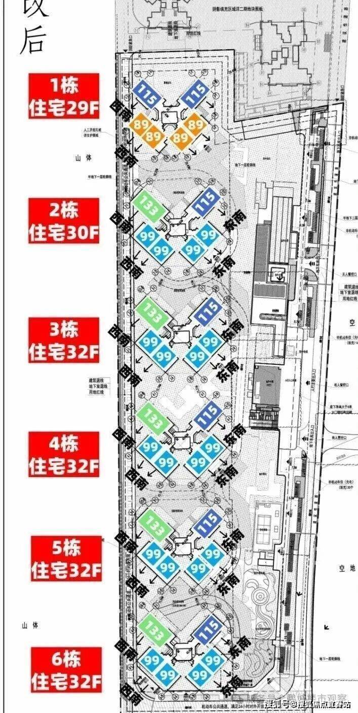 99㎡的4房2厅2卫,设计的是竖厅格局,客厅3.35米开间,LDKB一体化,S墙设计预留双开门冰箱卡槽位,三开间朝南,动静分区,U型厨房,公卫三段式干湿分离,赠送设备平台,得房率约78.27%(不含赠送),客厅连接次卧出9.37m²大阳台西南或东南朝向。靓点:99平做到了4房2卫,主卧270°无柱转角飘窗,厨房烟道外置+额外赠送设备平台,并且是纯南向格局。
