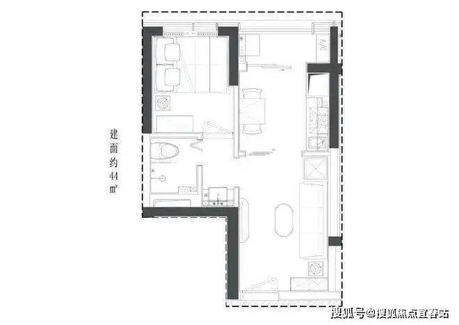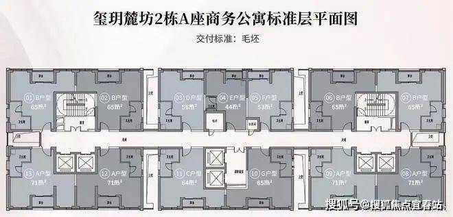 目前在售的商务公寓户型包括44㎡的1房、53-56㎡的1房以及63-65㎡和71㎡的2房2厅1卫。