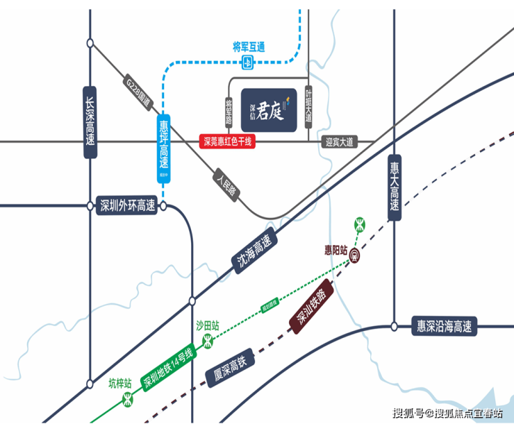 交通方面,项目临近深莞惠红色干线,连接迎宾大道再到将军路。