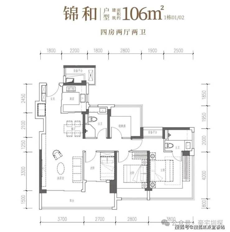 建面约106㎡宽幕人生,以IMAX光幕揽景,以LDKB方厅聚情,更以转角视野与匠心细节,奢享从容生活。• 锦瑟·建面约107㎡4房2厅2卫:双龙抱珠,一线园景,奢阔雅居