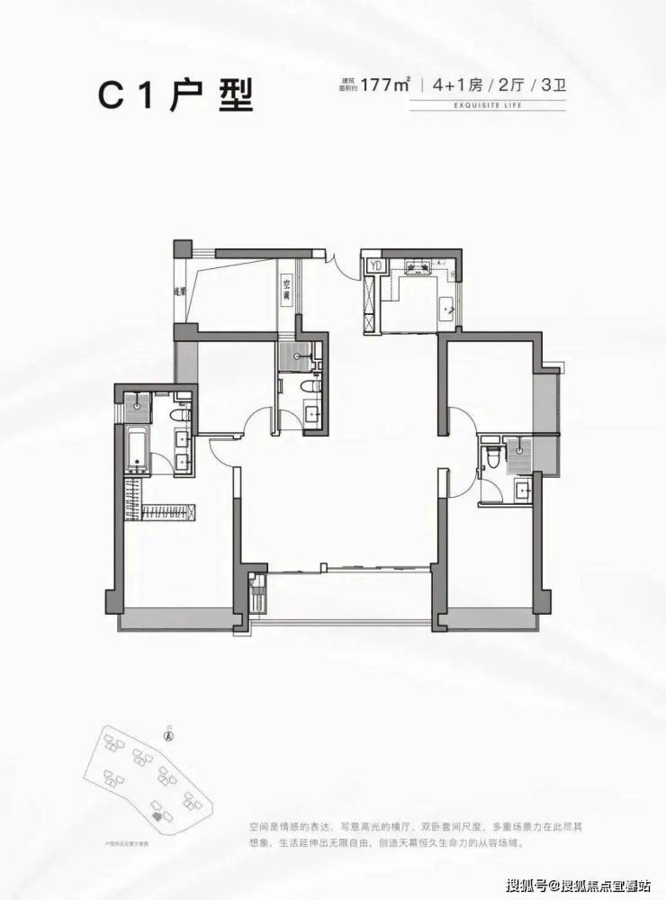 177平:5房2厅3卫,西南朝向,使用率77.43%(不包含赠送)