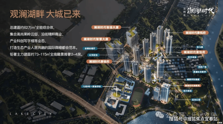 澜湖时代,由深物业集团开发,项目总占地面积约6.8万㎡,总建筑面积约62万㎡,计容建筑面积约43万㎡,共分3个地块开发,总规划约2700户,将建成集产业生产研发、住宅、商业街区于一体的产城综合体,是龙华北片区新的大型标杆项目。