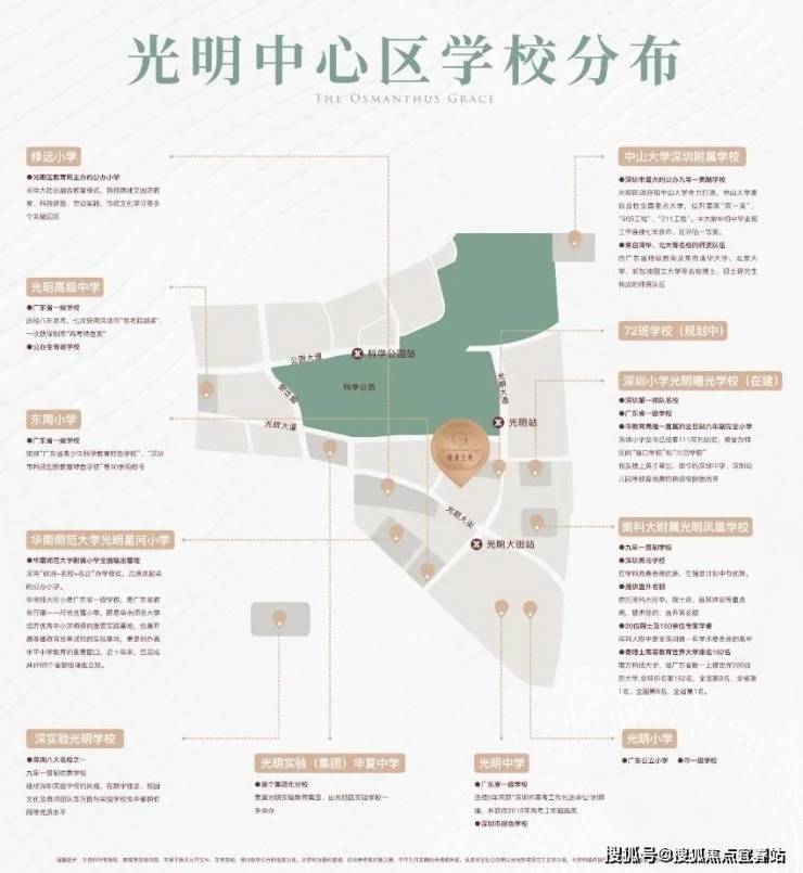 优质小学:项目北侧72班学校(在建,预计24年开始招生)、光明小学、深圳小学光明曙光学校(在建,预计24年开始招生)、华师大附小等