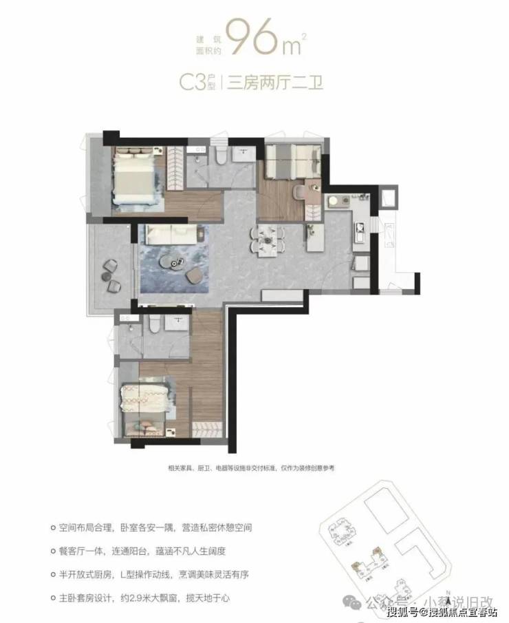 96㎡的3房2厅2卫(C2),设计的是竖厅经典格局,餐客厅一体化,三开间朝南,主卧套房设计,U型厨房,公卫三段式分离设计,阳台东南朝向。