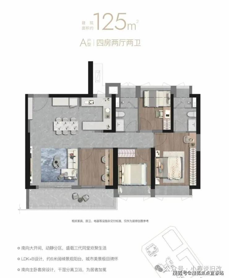 125㎡的4房2厅2卫,设计的是竖厅格局,LDK+B一体化,四开间朝南,主卧套房设计,U型厨房,6米长的大阳台,东南朝向。