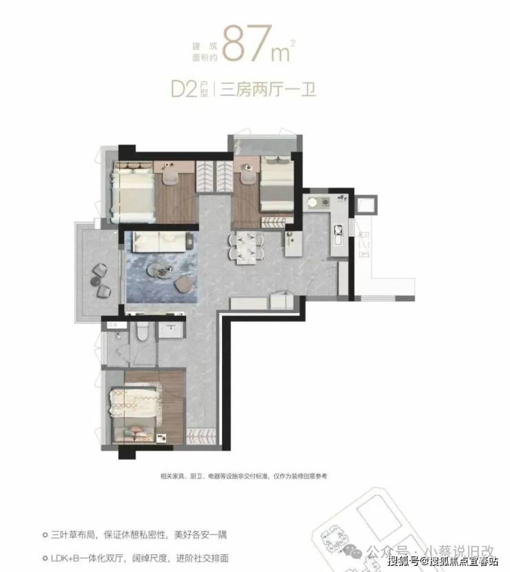 87㎡的3房2厅1卫(D2),设计的是竖厅三叶草格局,LDK+B一体化双厅,U型半开放式厨房,阳台西南、东北朝向。