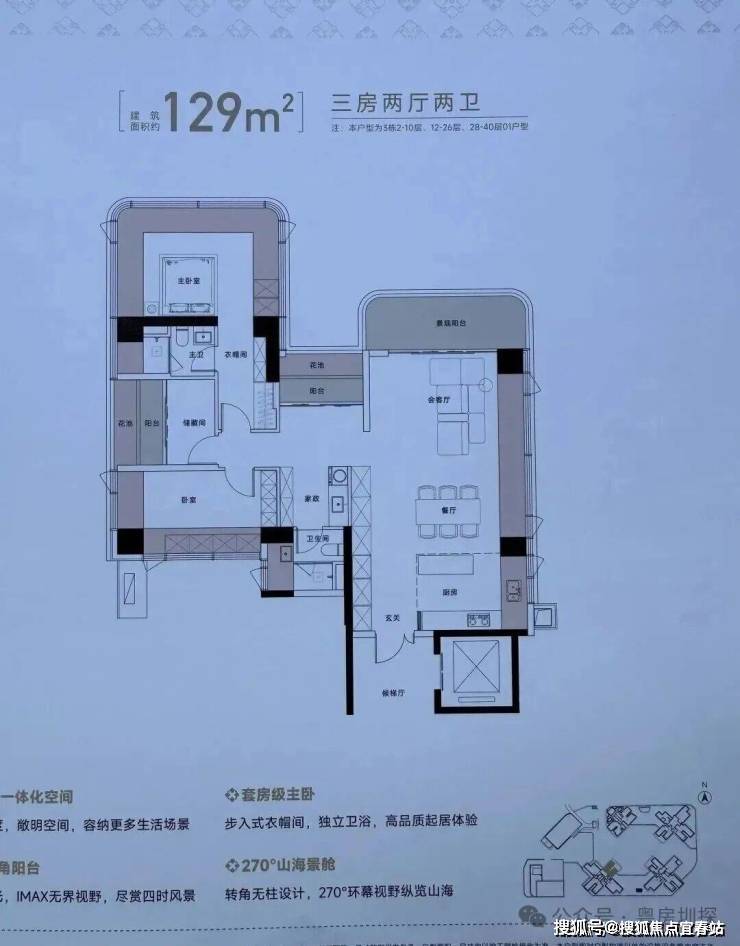 将地标高度/创新设计/极致景观/自然融合四大要素集于一体,约150米地标建筑以45°错位转体设计,实现四户分踞四角的独立瞰景布局,每户均可享有极致山海景观。约55米超宽楼间距、0.6的黄金窗墙比远超常规住宅0.3-0.5的标准,呈现山景、海景、花园三重景观界面。