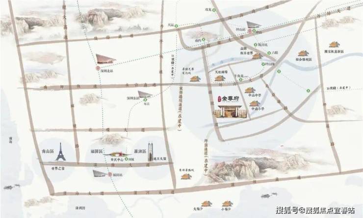 金尊府位于深圳市坪山区坪山大道与锦龙大道交汇处,中山小学西侧。距离地铁14号线(在建)牛角龙站约600米,未来地铁可达福田CBD。金尊府占地约3.7万㎡,总建筑面积23.6万㎡,集国风大宅、缤纷商业、幼儿园于一体。约1.8万㎡传世中式园林,采用“金镶玉”设计理念,匠造“一苑八府”宅邸布局,为城市塔尖定制“居于府,憩于园”的现代府居生活。