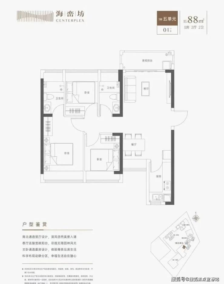 88㎡的3房厅2卫(1栋5单元01户型),设计的是竖厅南北通透格局,LDKB一体化设计,动静分区,四开间朝南,L型厨房,得房率:71.1%(不含赠送),阳台西北朝向。