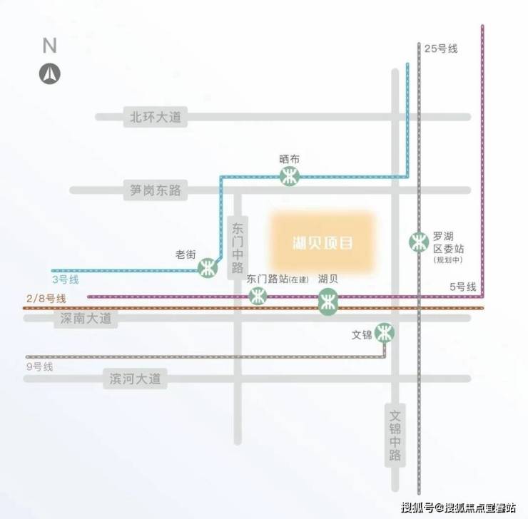 2/8号线湖贝站 | 3号线晒布站 | 5号线东门路站(在建)9号线文锦站 | 25号线罗湖区委站(规划)