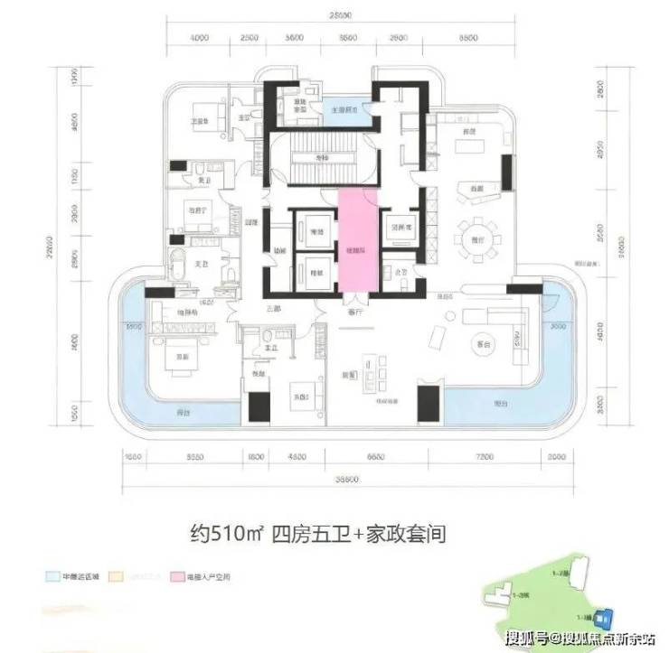 1A栋(1栋一单元)-43层:3梯1户,约510㎡,一层一户,私密性极致,为项目旗舰户型。