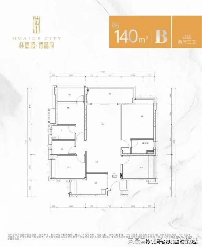 140㎡4房2厅3卫:户型东北朝向和东南朝向设计,几乎全飘窗+大双阳台设计,赠送拉满,客厅4.1米开间,双主卧套房设计,其中一个套房以阳台报建了部分面积,卧室分别做到了3.7米/3.3米/2.9米/2.9米的宽度,L型厨房,卫生间干湿分离设计,共2.5开间双阳台设计,要是三个卫生间也做飘窗,那赠送面积就拉满了。卧室、厨房和卫生间尺寸都能做到比较舒适,空间利用效率较高,整体户型设计没啥毛病。