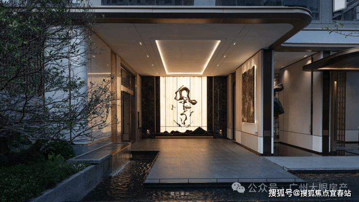5栋的「云栖·西派艺术馆」 雕塑长廊与立体庭院串联,巧妙地陈设“风”字的金属雕塑、形似层峰叠峦的艺术壁画、融入白云山沉淀的绿宝石。