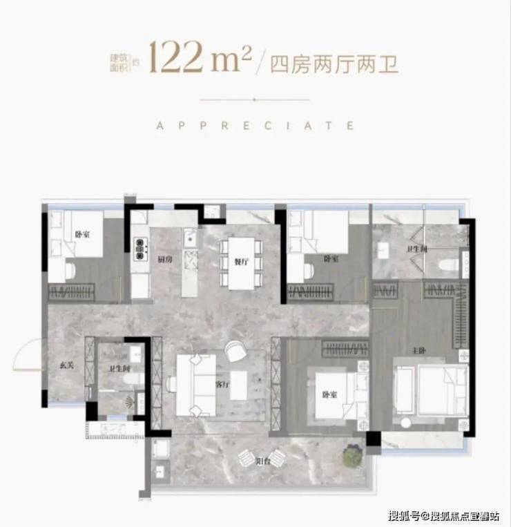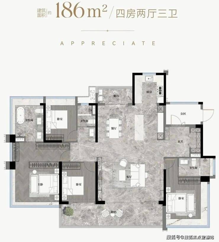 二期的10#,位置在小区中间,更加安静,定价比起去年卖的一期贵,当然,使用率方面,跟一期比起来也做了进一步提升,算上花池、阳台跟飘窗等赠送面积,使用率接近130%,主力的户型只有两个,分别是建面约105m²的四房和建面约128m²的四房。