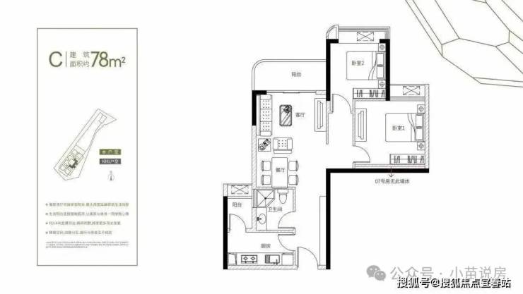 建筑面积约76-78㎡2房+1卫(灵活多变+1多功能空间)
