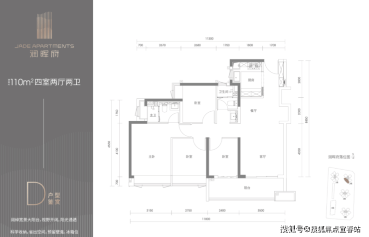 E户型是110㎡四房二卫横厅户型,则是B户型的放大版。西南朝向,户型方正,三个次卧的面积均在9平米以上,主卧18平左右。再加上双面采光对流,基本上不存在采光死角。