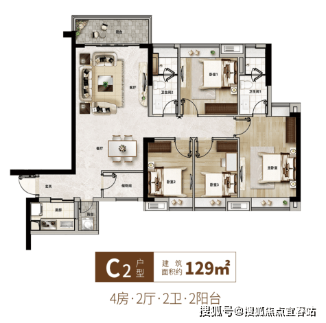 129㎡户型延续了110㎡户型的布局增加了一个次卧,整体设计上也没有浪费面积。