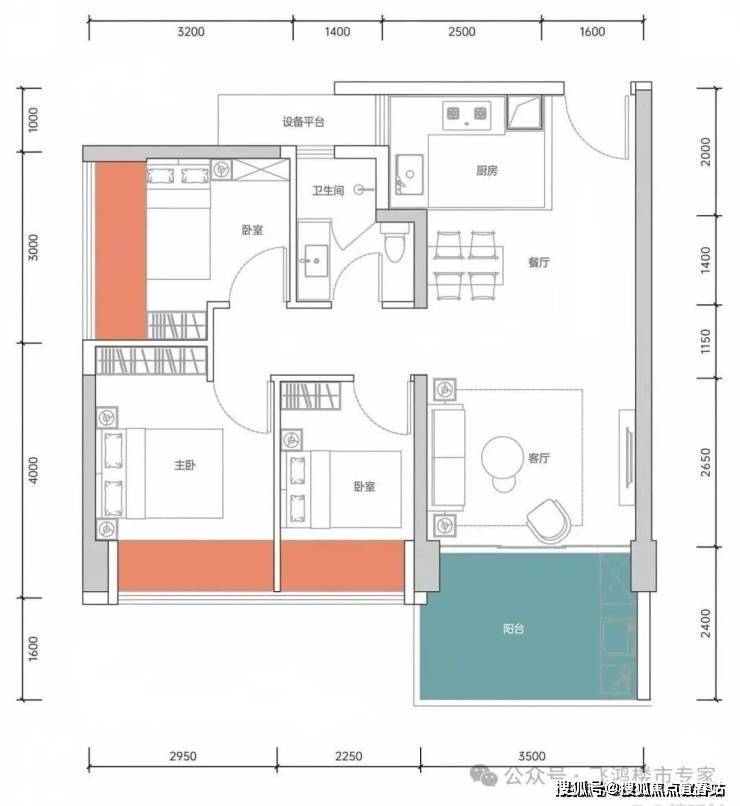 72㎡的3房2厅1卫户型,采用竖厅格局,客厅开间3.5米,LDKB一体化设计,动静分区合理。三个卧室分别做到了主卧11.28㎡、次卧8.57㎡和另一间次卧7.76㎡(包含墙体飘窗),客厅还连接一个3.78㎡的大阳台。
