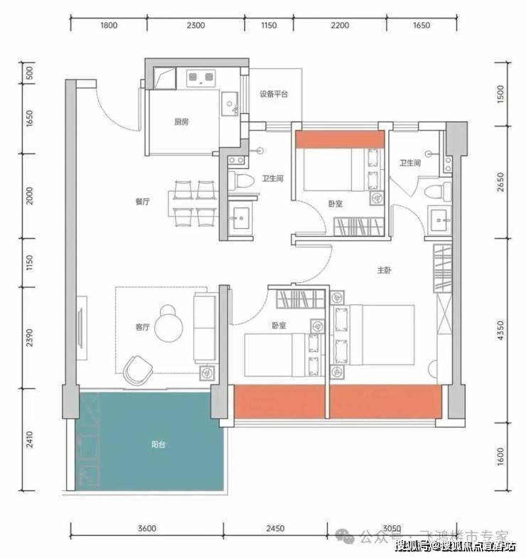 88㎡的3房2厅2卫户型则更为舒适,客厅开间3.6米,三开间朝南,设计有双卫生间1。这种户型对于有孩子的家庭尤为合适,避免了早高峰抢卫生间的尴尬。