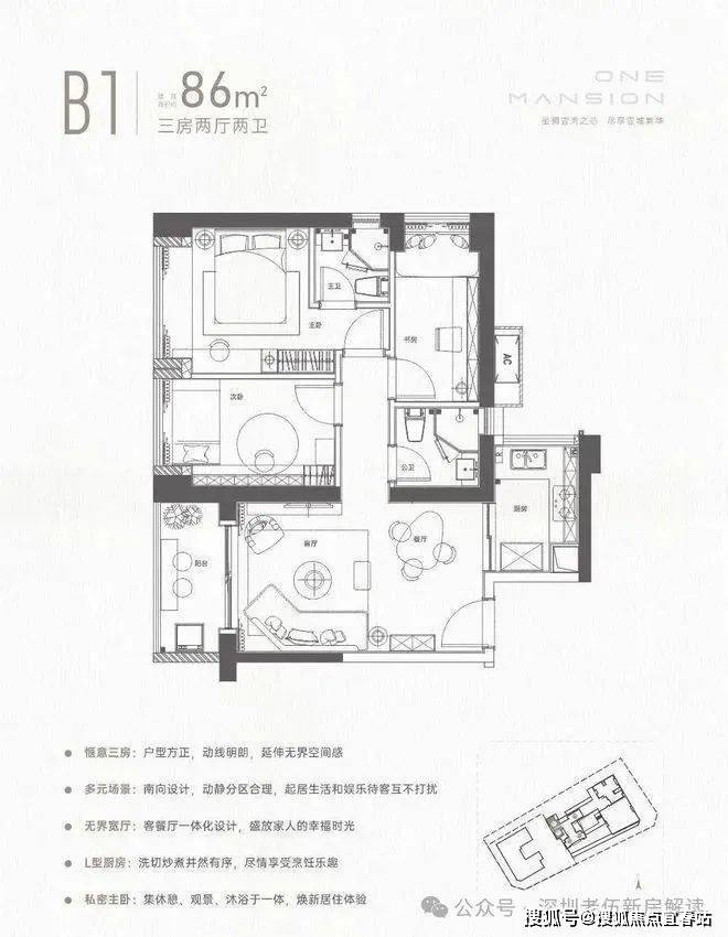 86㎡的3房2厅2卫,设计的竖厅格局,餐客厅一体化设计,三开间朝南,L型厨房,得房率72.47%(不含赠送),西南朝向。