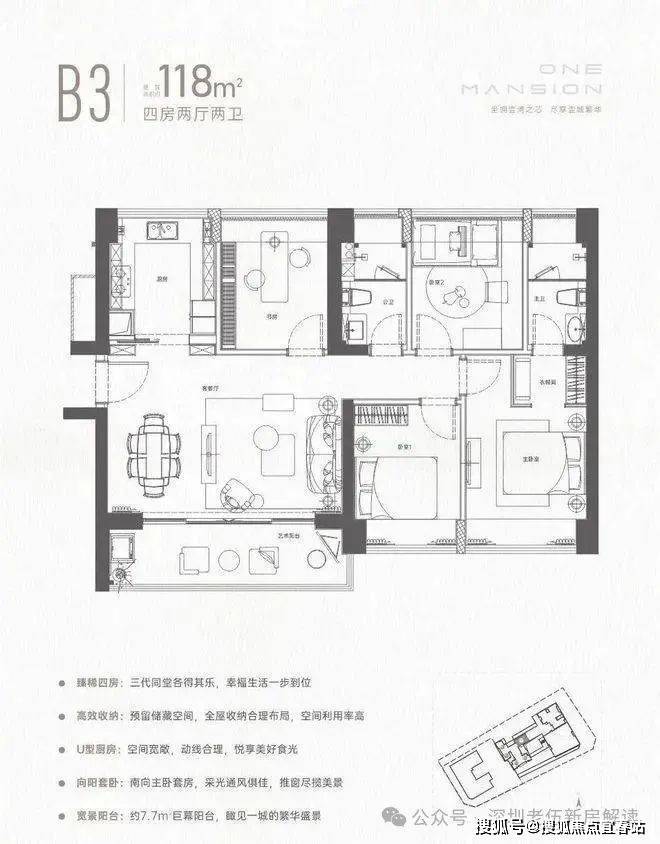 118㎡的4房2厅2卫,设计的横厅南北通透格局,全屋飘窗设计,三开间朝南,U型厨房,约7.7米长超大阳台,得房率72.47%(不含赠送),阳台主朝东南朝向。