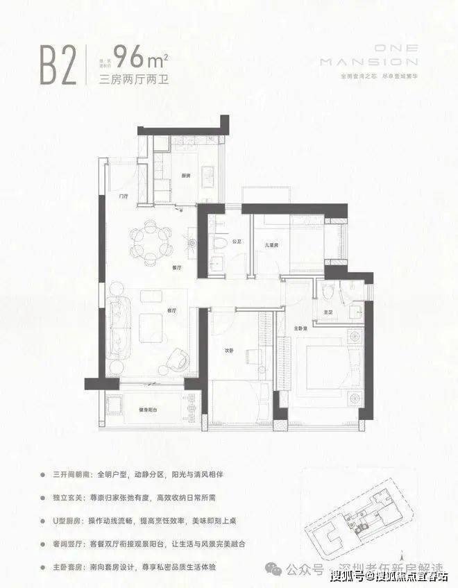 96㎡的3房2厅2卫,设计的经典竖厅格局,餐客厅一体化设计,三开间朝南,L型厨房,得房率72.47%(不含赠送),东南朝向。