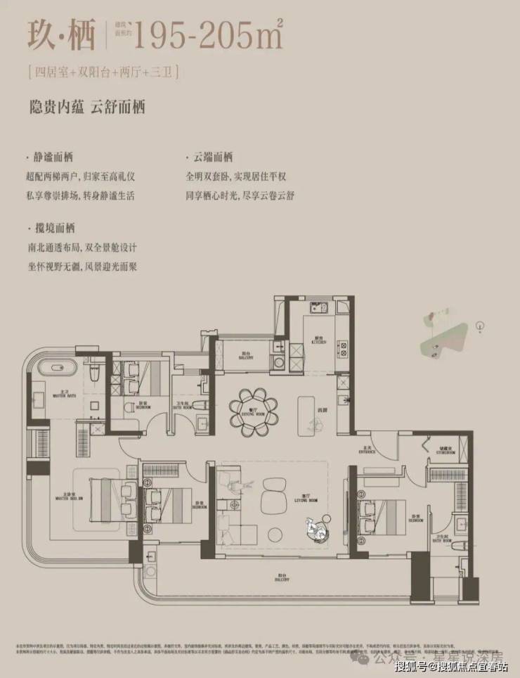195-205平4房南北通透布局,整个户型十分通透大气。独立电梯入户,四开间朝南、中西双厨房、双套房等设计。