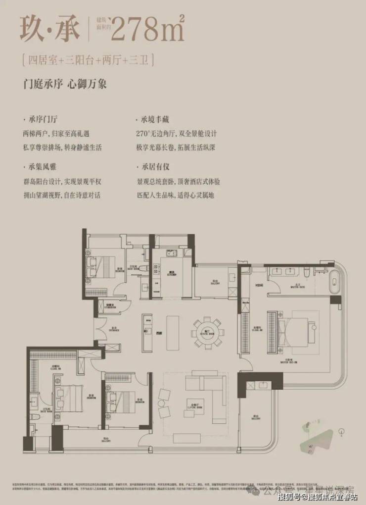 278平4房独立电梯入户,超大南北通一体化客餐厅,三阳台设计,顶级270°景观主卧套房,南向超长全景采光面,户型通透大气。