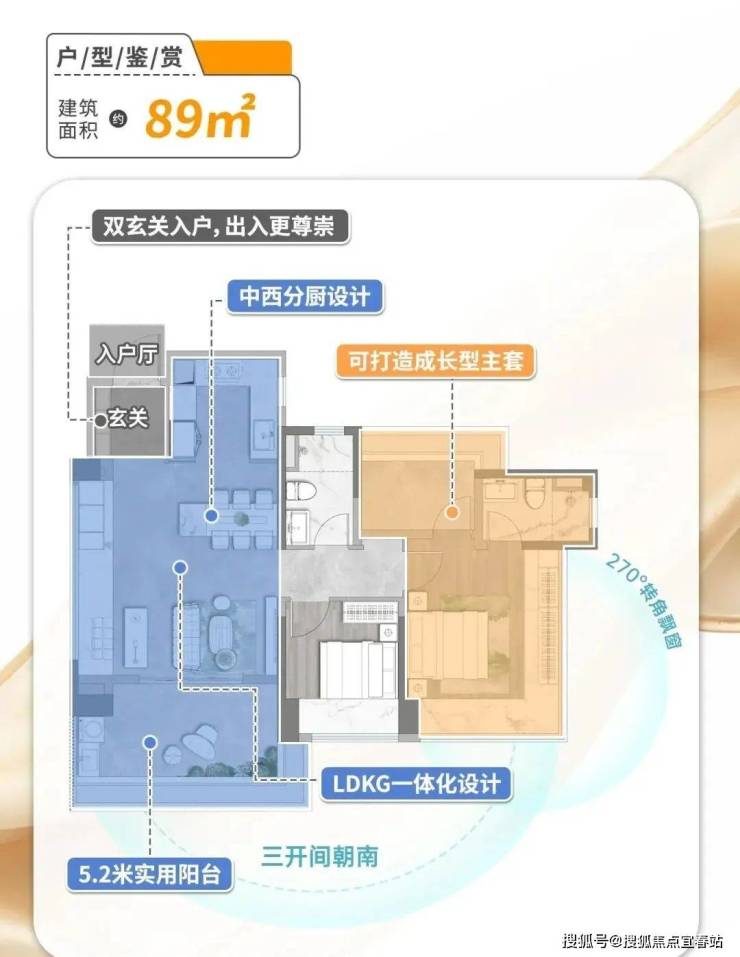 建面89㎡三房两卫:主打高使用率(约115%),4.8米横厅设计,LDKG一体化空间(客厅、餐厅、厨房、阳台联动),搭配270°全景飘窗及28㎡主卧套房,灵动可变三房布局。